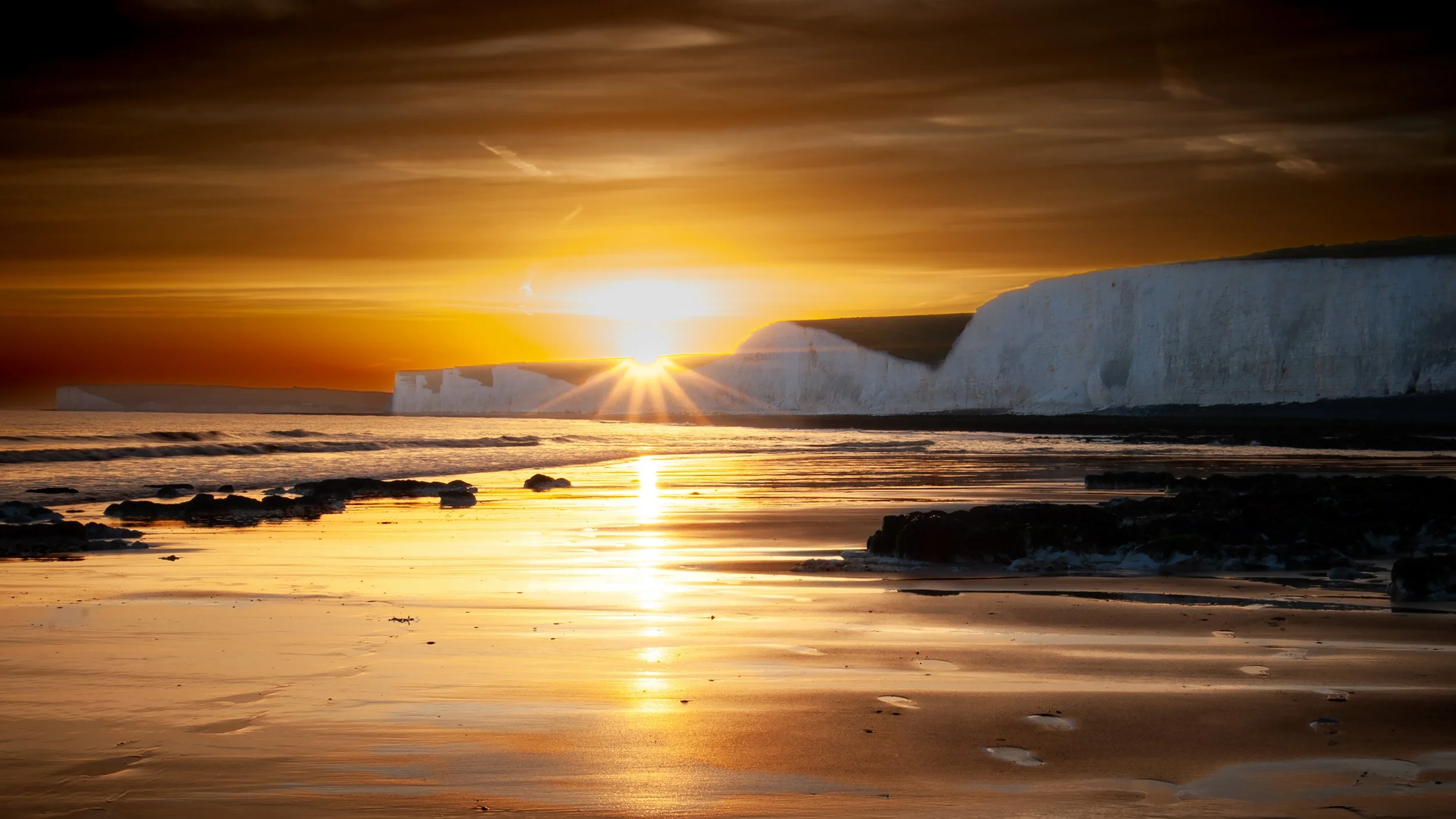 The white chalk cliffs, part of the iconic Seven Sisters, are bathed in amber light, their rugged faces glowing warmly by the setting sun.